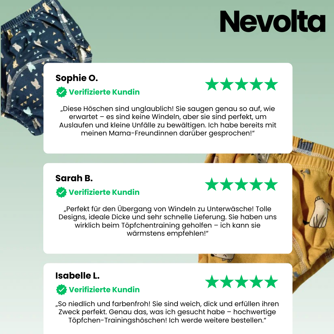 Mit unseren Nevolta-Lernhöschen profitieren Sie vom Besten aus beiden Welten: einem bequemen, niedlichen Design für Ihr Kind und einem stressfreien Töpfchentraining für die ganze Familie.
